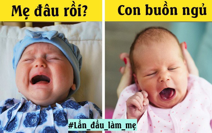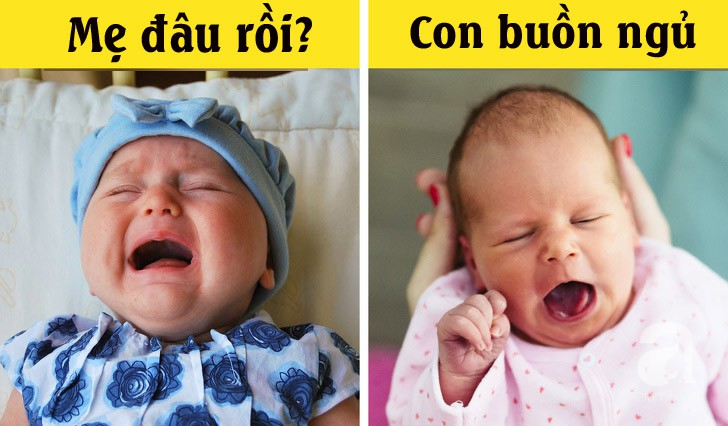 Khóc vì buồn ngủ: Khi em bé muốn ngủ nhưng không thể ngủ được vì một lý do nào đó, tiếng khóc của chúng sẽ nghe như tiếng rên rỉ, sau đó là tiếng ngáp. Em bé cũng sẽ dụi mắt và tai.